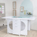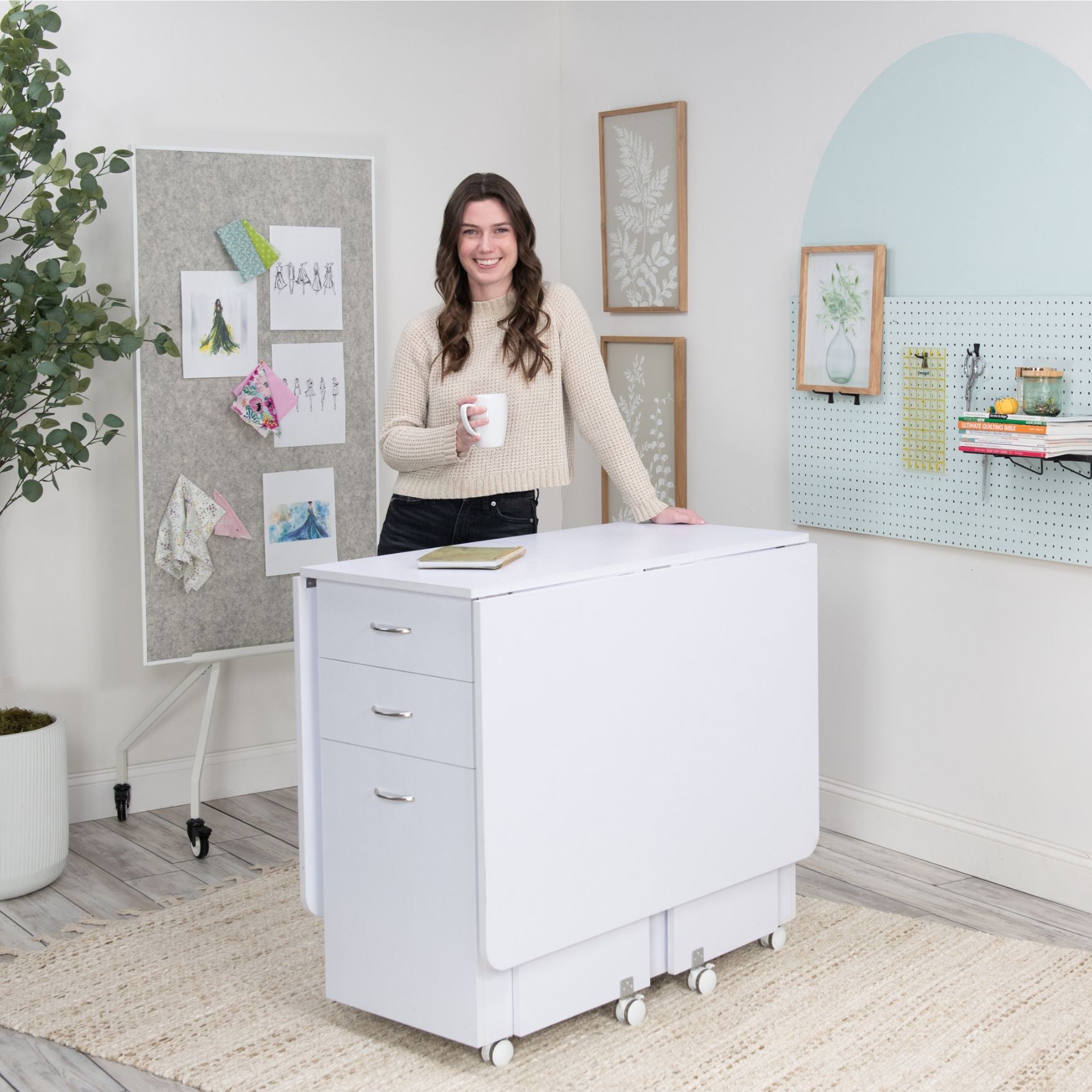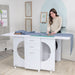 The Koala Cutting Table is a versatile workspace designed to enhance your sewing or crafting experience. With its double-sided storage featuring two front drawers and an alcove, plus accessory and fabric bin storage in the back, the Cutting Table offers ample space for your tools and materials. Its large work surface is positioned at an ergonomic height for comfortable standing while working.